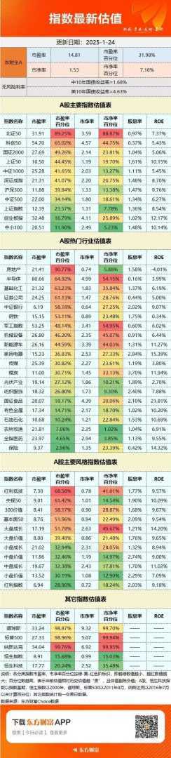 截至1月24日收盘,东财全A及宽基、行业指数估值分化明显。东财全A市盈率为14.81倍,市净率为1.53倍;北证50、房地产市盈率百分位高,而中小100、保险市盈率百分位低。投资者需谨慎配置。