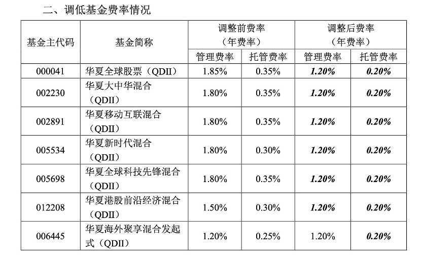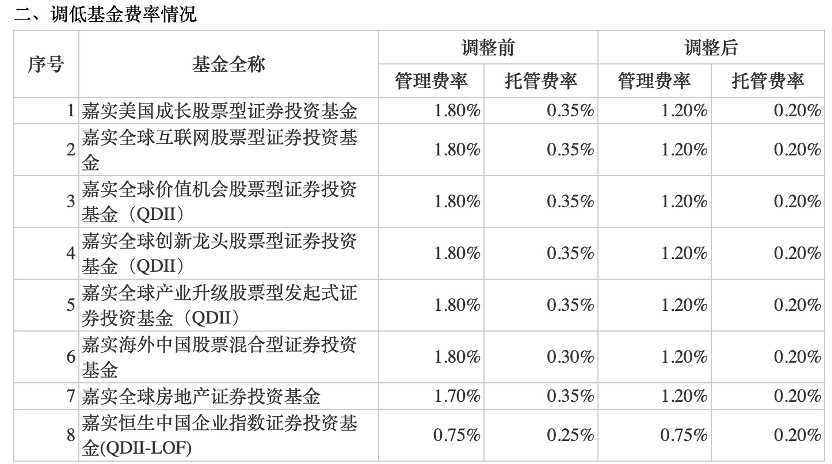 自1月23日起,汇添富率先行动,调低了旗下多只QDII基金的管理费率和托管费率。紧随其后,1月24日和25日,包括易方达、华夏、嘉实、工银瑞信、万家、长盛等在内的近十家基金公司纷纷发布公告,宣布调低旗下部分基金费率,并对基金合同、托管合同进行修订。本轮降费的重点集中在QDII基金上。