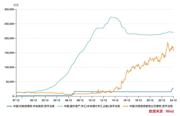 该科目反映了央行通过中期借贷便利(MLF)、抵押补充贷款(PSL)、逆回购、各类再贷款等货币政策工具操作向银行提供的资金支持,市场通常将其称为“广义再贷款”。2024年末,广义再贷款规模有所下降,与此同时,外汇占款也呈现下降趋势,意味着通过这两者投放的基础货币减少。然而,国债净买入的增加,显示出央行正更多地通过国债买卖来提供基础货币。