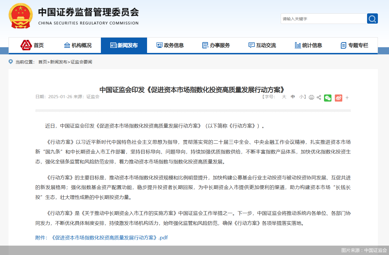 为深化资本市场指数与指数化投资的高质量发展,中国证监会于1月26日出台了《行动方案》,该方案共包含12条具体措施,是《关于推动中长期资金入市工作的实施方案》中的重要组成部分。