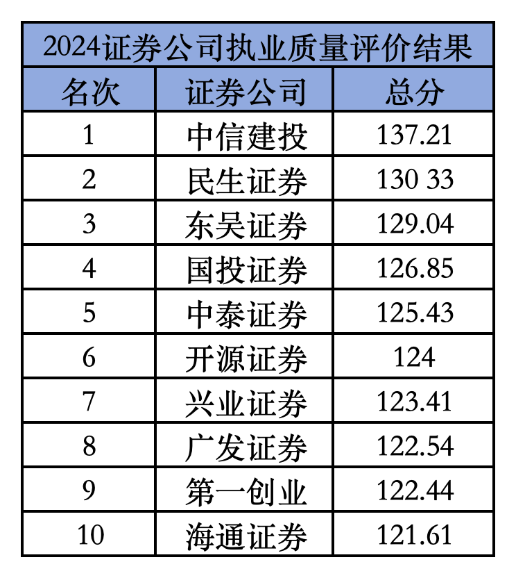 在备受瞩目的前十名榜单中,中信建投证券以总分137.21分的优异成绩傲视群雄,夺得榜首之位。民生证券则以130.33分的佳绩跃升至第二位,东吴证券则以129.04分的成绩紧随其后,位居第三。此外,国投证券、中泰证券、开源证券、兴业证券、广发证券、第一创业证券以及海通证券也凭借出色表现跻身前十,分数分别为126.85分、125.43分、124分、123.41分、122.54分、122.44分和121.61分。