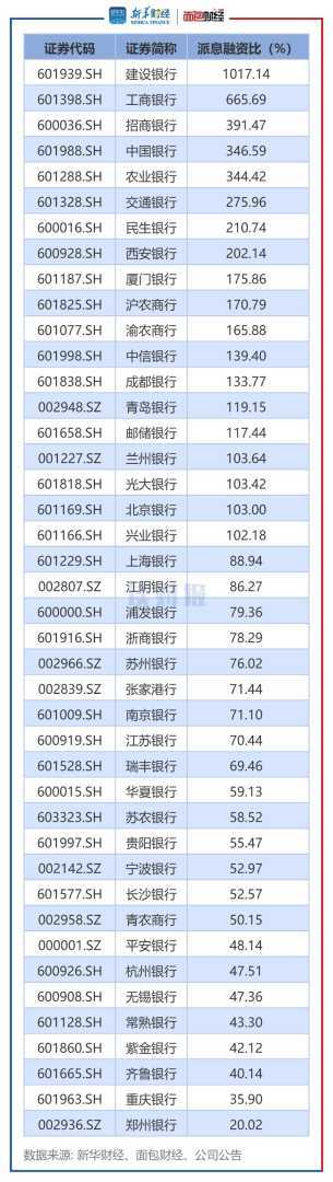 除了分红情况外,新华财经和面包财经的研究员还对42家上市银行自上市以来的派息融资比进行了详细统计。数据显示,19家银行的派息融资比超过100%,其中建设银行更是高达1017.14%,显示出其卓越的盈利能力和股东回报能力。
