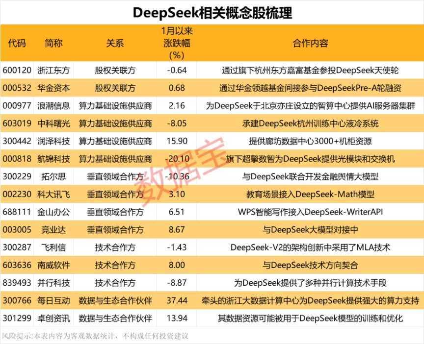 随着DeepSeek的火爆出圈,与之相关的概念股也随之浮出水面。其中,浙江东方通过旗下杭州东方嘉富基金参与了DeepSeek的天使轮投资;华金资本作为珠海国资旗下的投资平台,通过华金领越基金参与了DeepSeek的Pre-A轮融资;浪潮信息和中科曙光则在算力基础设施方面为DeepSeek提供了供应服务;拓尔思与DeepSeek联合开发了金融舆情大模型,并在中信证券等机构部署了智能研报生成系统;科大讯飞则接入了DeepSeek-Math模型,推出了AI数学辅导应用“星火助学”。