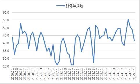 季节性影响显著,钢市需求持续收缩。1月份,受寒冷天气及春节假期的叠加影响,钢铁市场需求进一步萎缩。北方地区因天气严寒,户外施工基本停滞,建筑项目大多进入停工状态,导致建筑用钢需求显著减少。南方地区虽气温相对较高,但受春节假期影响,施工人员陆续返乡,建筑工程进度放缓,建筑用钢需求也有所下降。此外,2024年冬储整体意愿不强,且在节前已基本完成,因此冬储对需求的影响有限。钢铁行业新订单指数为41.7%,环比下降7个百分点,显示出市场需求的持续疲软。