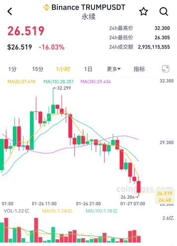 【导读】加密货币市场风云突变,TRUMP币价格遭遇重创,跌幅超过16%,最低交易价触及26.304美元/枚。