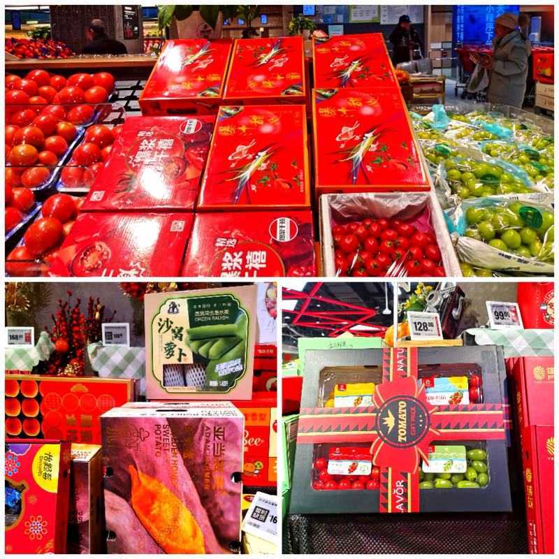 此外,一些蔬菜类“水果”也加入水果礼盒行列,成为新的潮流。在吉鲜超市(吉嘉港店)、盒马(西红门店)等地,小番茄、沙窝萝卜等礼盒被摆上水果柜台。这类蔬菜因生吃口感甘甜,近年来逐渐被赋予“水果”属性。