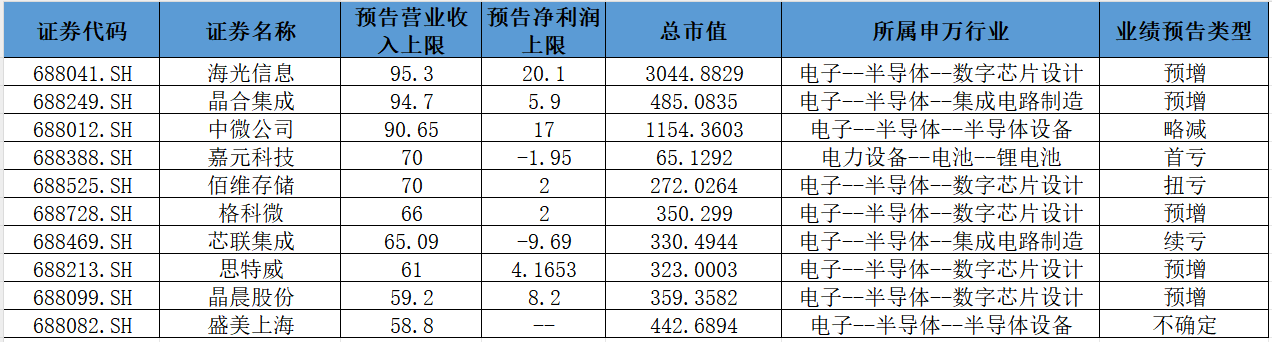 在已发布业绩预告的科创板公司中,营收规模排名前10的公司依次为海光信息、晶合集成、中微公司、嘉元科技、佰维存储、格科微、芯联集成、思特威、晶晨股份、盛美上海。值得注意的是,除嘉元科技外,其余9家公司均属于半导体行业,且营收规模上限预计均超过58亿元。这凸显了半导体行业在科创板中的重要地位。