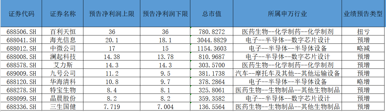 科创板公司2024年业绩预告净利润前十排名(数据截至1月26日)进一步证明了科创板上市公司的盈利能力。