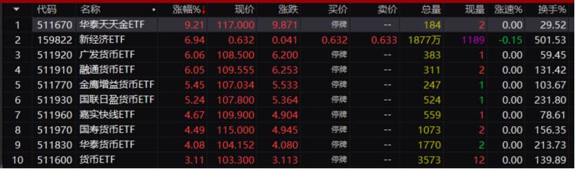 货币基金市场再现异常波动!今日午间收盘,多只货币ETF突然暴涨,其中华泰天天金ETF涨幅高达9.21%,报价117元;广发货币ETF与融通货币ETF涨幅亦超过6%,其余6只货币ETF涨幅均超过3%。此番暴涨后,上述9只货币型ETF迅速被集体停牌。