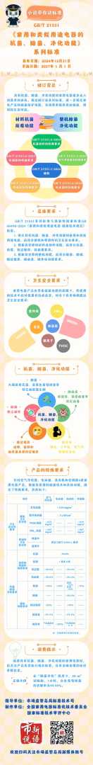 近日,国家市场监督管理总局(国家标准化管理委员会)正式批准并发布了《家用和类似用途电器的抗菌、除菌、净化功能》系列标准,该系列共计6项国家标准,涵盖了产品通则以及针对抗菌材料、空气净化器、电冰箱、洗衣机、空调器的特殊要求。