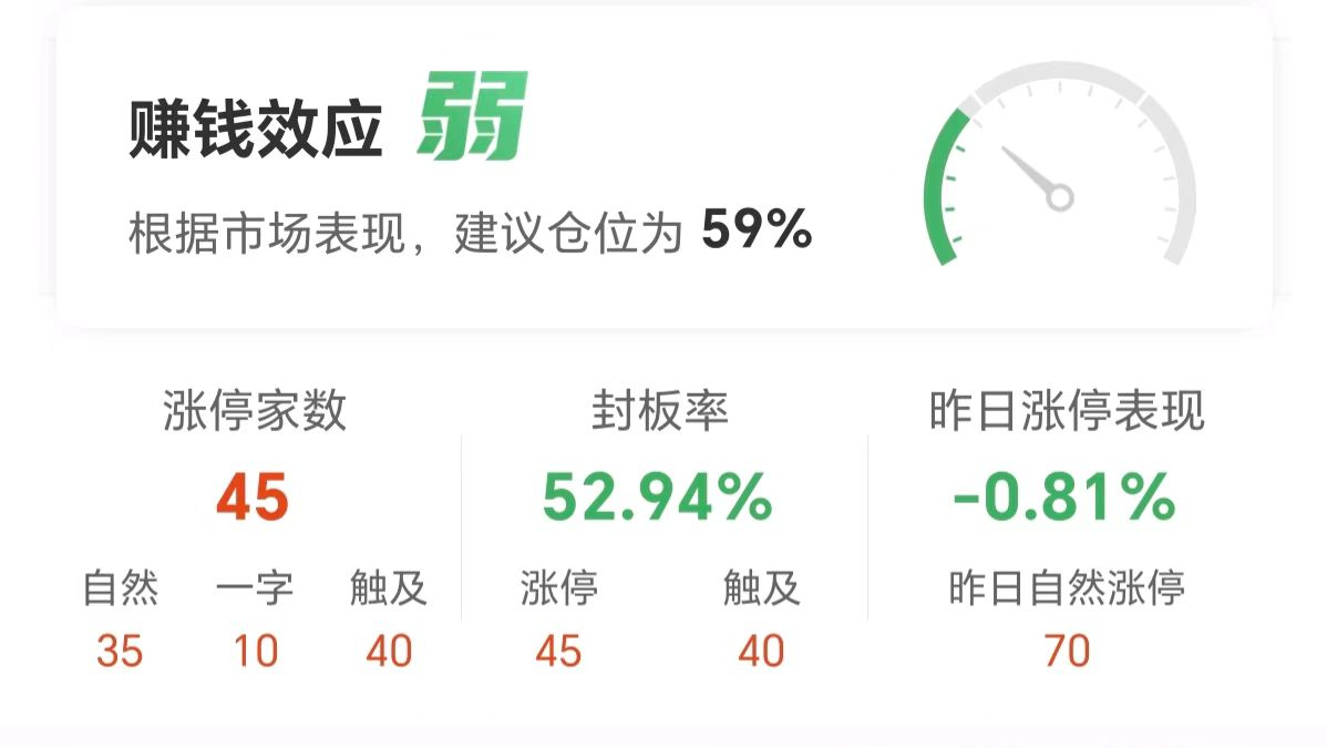 在个股涨停方面,今日市场共计45只个股涨停,显示出一定的市场活跃度。同时,还有40只个股在盘中一度触及涨停,但最终封板率为52.94%,显示出市场涨停个股的分化态势。