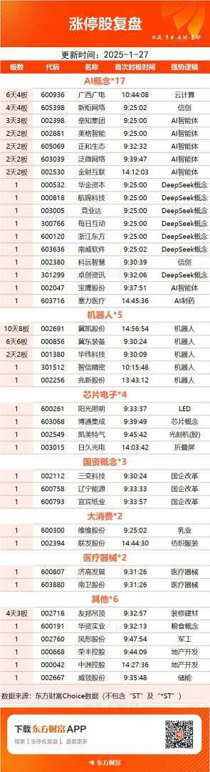 在板块方面,市场表现呈现出明显的分化。Deepseek、AI语料、银行等板块表现出色,涨幅居前。其中,DeepSeek概念的走强尤为引人注目,航锦科技、美格智能等多只个股涨停。同时,AI智能体概念也继续活跃,垒知集团、美格智能等个股同样封上涨停板。然而,CPO、铜缆高速连接、机器人等板块则表现不佳,跌幅居前。