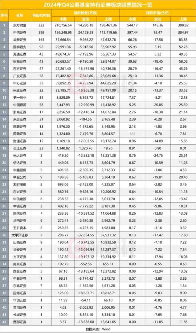 在公募基金四季度券商股持仓情况中,东方财富表现抢眼,新进入前十大重仓股名单。据统计,共有322家机构持有东方财富,合计持股市值达到544.17亿元,环比增加145.36亿元,持股数量也实现了7.28%的环比增长。此外,中信证券的持仓比例同样显著提升,持股市值增加至397.44亿元,环比增长显著。