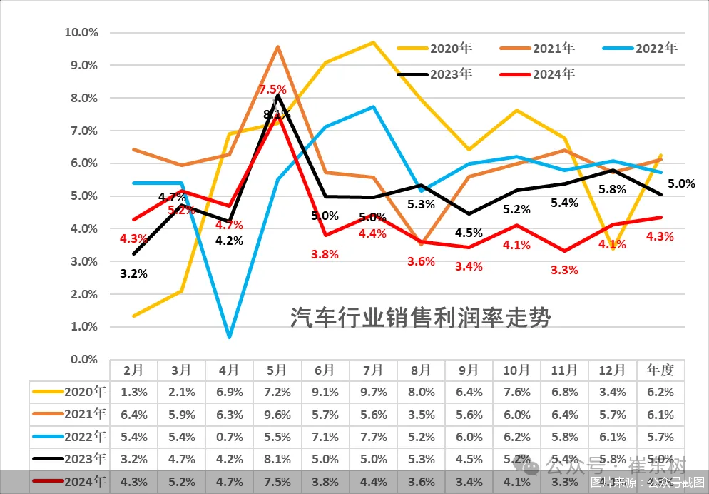 中国汽车流通协会乘用车市场信息联席分会秘书长崔东树发布报告称,2024年中国汽车行业总收入达10.65万亿元,同比增长4%,但利润同比下降8%至4623亿元,行业利润率为4.3%,低于下游工业企业平均水平。12月单月收入1.19万亿元,同比增长13%,但利润同比下降13.5%。