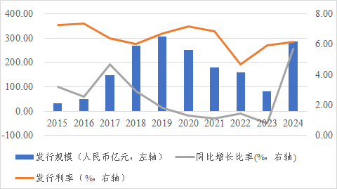 境外债一级市场受国内外多重因素影响,包括境内监管政策、境外财政政策以及实体企业的融资需求等。近十年来,河南省境外债发行规模伴随中国资本市场与外汇市场的蓬勃发展而波动增长,尤其在2024年,河南省境外债发行规模显著回升。