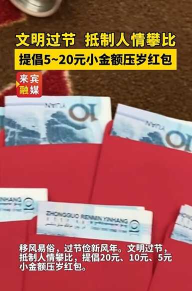 此前,广西百色市已于1月7日由市委宣传部与市精神文明办发出类似呼吁,倡议在直系亲属间发放不超过20元的小额压岁钱,让压岁钱回归其祝福的本质,并要求党员干部带头落实。