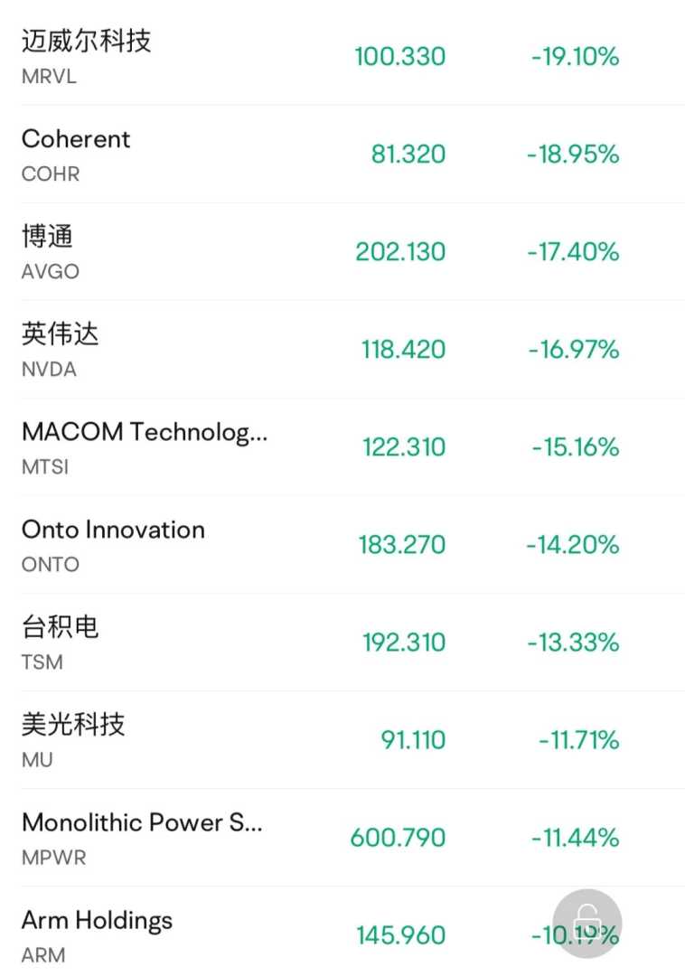 在英伟达股价暴跌的同时,其他芯片股也未能幸免。费城半导体指数大幅下跌9.15%,迈威尔科技、博通、台积电、美光科技等芯片巨头均出现大幅下跌。