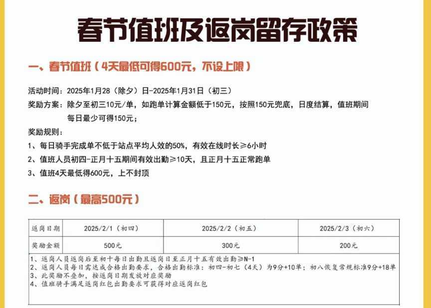 一位山西的美团骑手向记者展示了他们的春节值班细则,其中提到除夕至初三的单价高达10元,且每天还有150元的保底收入,不设上限。山东美团乐跑骑手则表示:“春节期间每单补贴1~4元,用餐高峰期补贴更高。”上海美团骑手透露,单价为10元,此外还有2000元的留守奖。