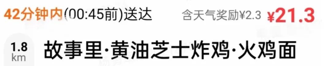 除了常规补贴外,平台还会发放天气补贴。部分骑手在春节前夕接到了单价高达20多元的订单。