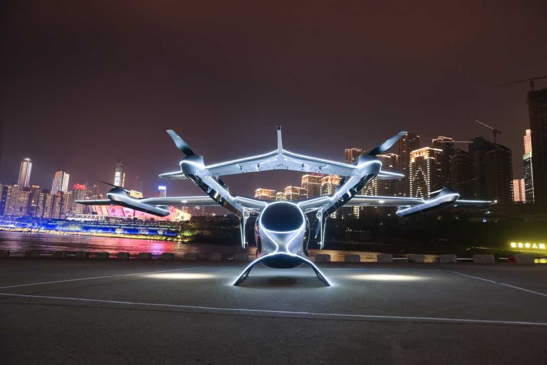 图为峰飞航空2吨级eVTOL航空器V2000CG凯瑞鸥,在夜空中闪耀。