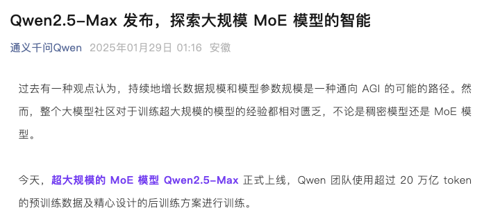 据通义千问Qwen微信公众号最新消息,2025年1月29日凌晨,阿里云通义千问宣布其超大规模的MoE模型Qwen2.5-Max正式上线,标志着中国AI技术领域的又一重大进展。