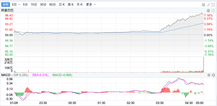 值得一提的是,农历除夕夜,阿里巴巴股价在收盘前出现异常波动,从涨幅1%快速拉升至6.71%,收盘报96.03美元,总市值达到2284亿美元。这一涨幅或与市场对阿里云及通义千问AI技术的积极预期有关。