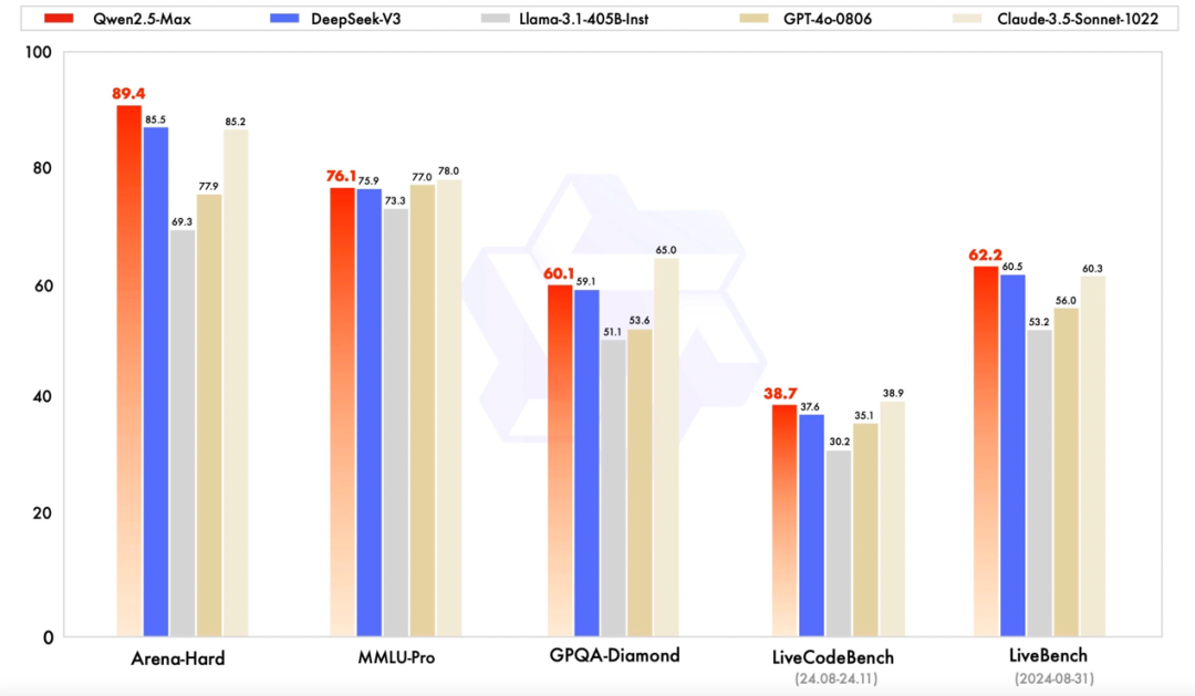 据介绍,Qwen2.5-Max采用超大规模MoE架构,基于庞大的预训练数据及精心设计的后训练方案进行训练。该模型在知识、编程、全面评估综合能力的以及人类偏好对齐等主流权威基准测试上,均展现出全球领先的性能。在与Claude-3.5-Sonnet、GPT-4o、Deepseek-V3及Llama-3.1-405B等模型的对比中,Qwen2.5-Max表现卓越,几乎全面超越了这些模型。