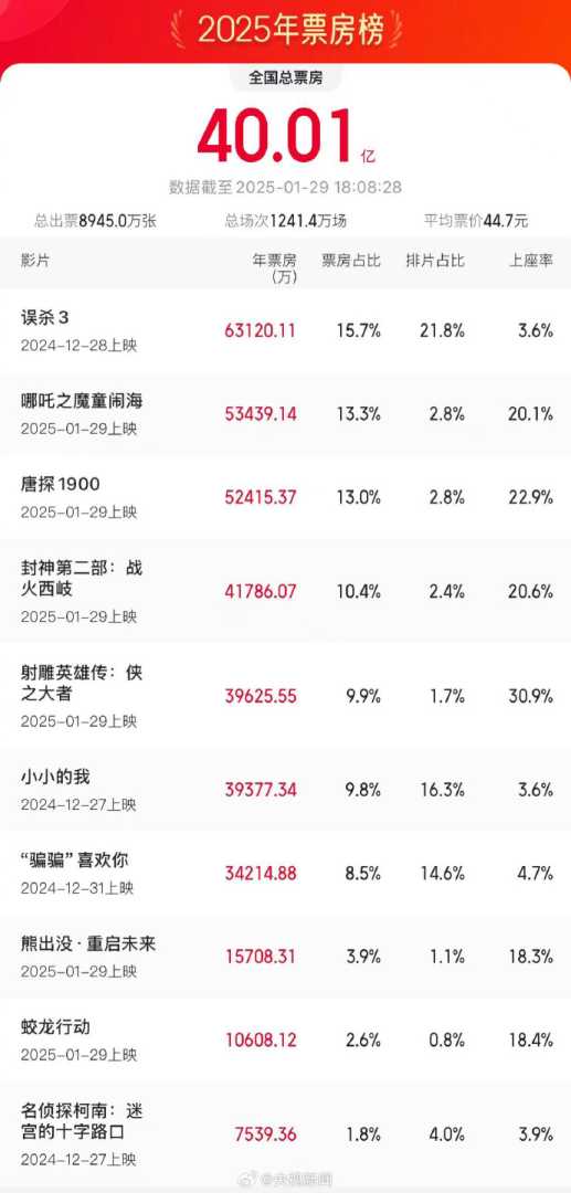 据各大网络平台汇总数据显示,截至2025年1月29日18时08分,即正值中国农历新年——蛇年大年初一之际,2025年度全国电影票房(含预售实时数据)已成功突破40亿元人民币大关,标志着中国电影市场在新的一年迎来了开门红。