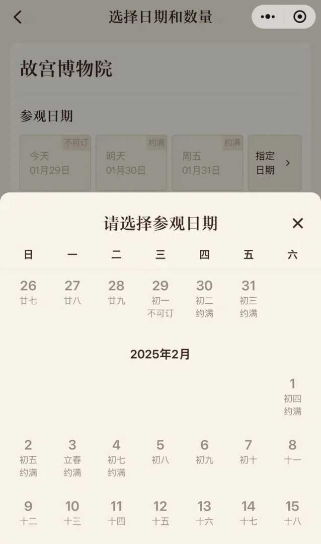 故宫博物院从大年初一到初七的门票已经全部约满售罄。