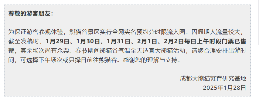 四川成都熊猫谷景区1月30日、1月31日、2月1日每日上午时段的门票也已售罄,其余场次尚有余票。