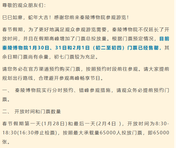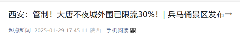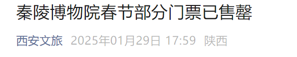 据起点新闻报道,1月29日晚,大唐不夜城外围已限流30%。秦陵博物院春节部分门票也已售罄。