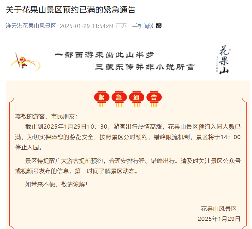 江苏花果山景区也发布了预约已满的紧急通告。