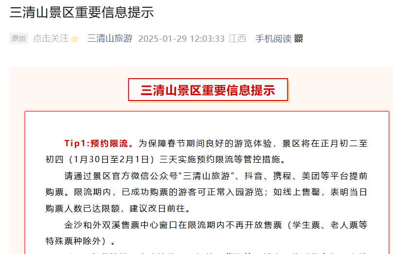 江西三清山景区发布公告称,将在正月初二至初四(1月30日至2月1日)三天内实施预约限流等管控措施。