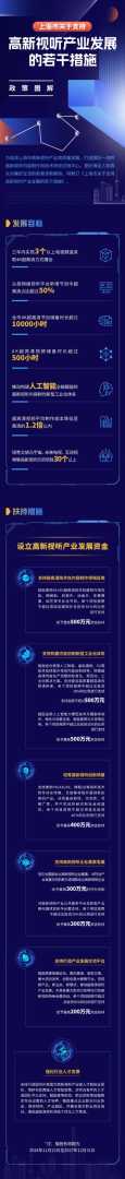 为推动高新视听产业快速发展,上海还设立了高新视听产业发展资金,将对高新视听产业链的关键环节进行扶持与奖励,单个项目最高扶持金额可达500万元,主要用于支持超高清技术应用、内容创制新型工业化体系构建、高新视听创新场景培育、企业集聚发展及产业发展交流平台打造等方面。