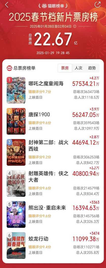 2025年春节档电影市场的火爆开局,无疑为全年电影市场注入了强劲的动力。随着春节档6部大片的同步上映,票房、影片口碑、特效表现等话题迅速成为社交媒体上的热点。1月29日,“票房”“哪吒特效”“唐探1900格局”等相关词条纷纷登上微博热搜榜,彰显了观众对于春节档电影的极高关注度。