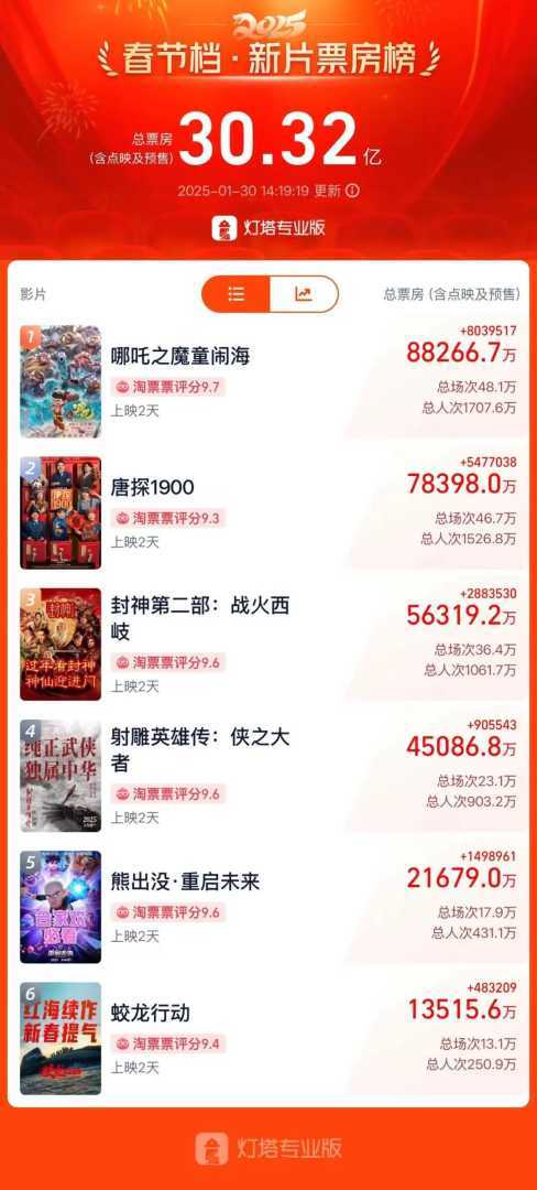 根据灯塔专业版数据,截至1月30日14时04分,2025年春节档(1月28日至2月4日)档期总票房(含预售)已突破30亿元人民币大关,再度刷新历史记录!《哪吒之魔童闹海》《唐探1900》和《封神第二部:战火西岐》成功跻身春节档票房榜前三甲。