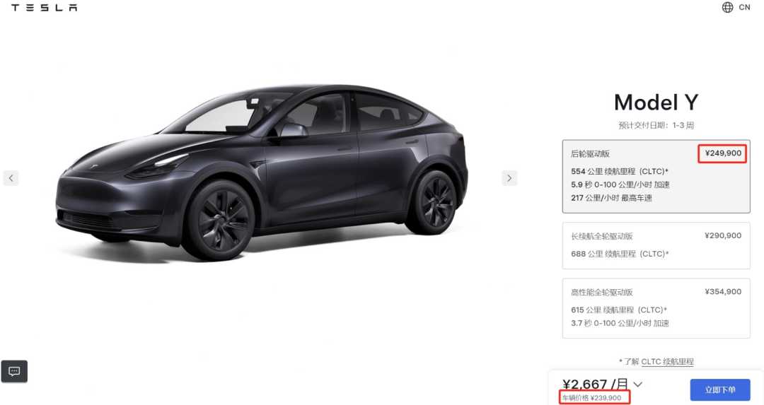 特斯拉官网已即时更新了这一优惠政策,Model Y后轮驱动版的下单价格已显示为239,900元,消费者可立即享受这一优惠。