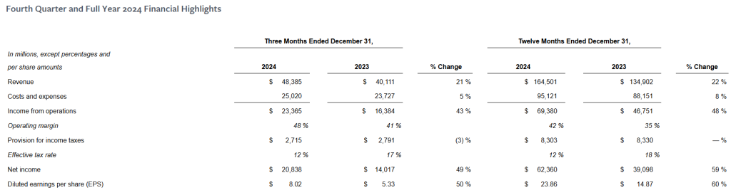同日,Meta公布了截至2024年12月31日的第四财季业绩。数据显示,公司第四财季营收达到483.85亿美元,同比增长21%,高于市场预期的469.9亿美元;净利润同比增长49%,达到208.38亿美元;摊薄后每股收益同比增长50%,至8.02美元。公司的营业利润率从上一年同期的41%跃升至48%。