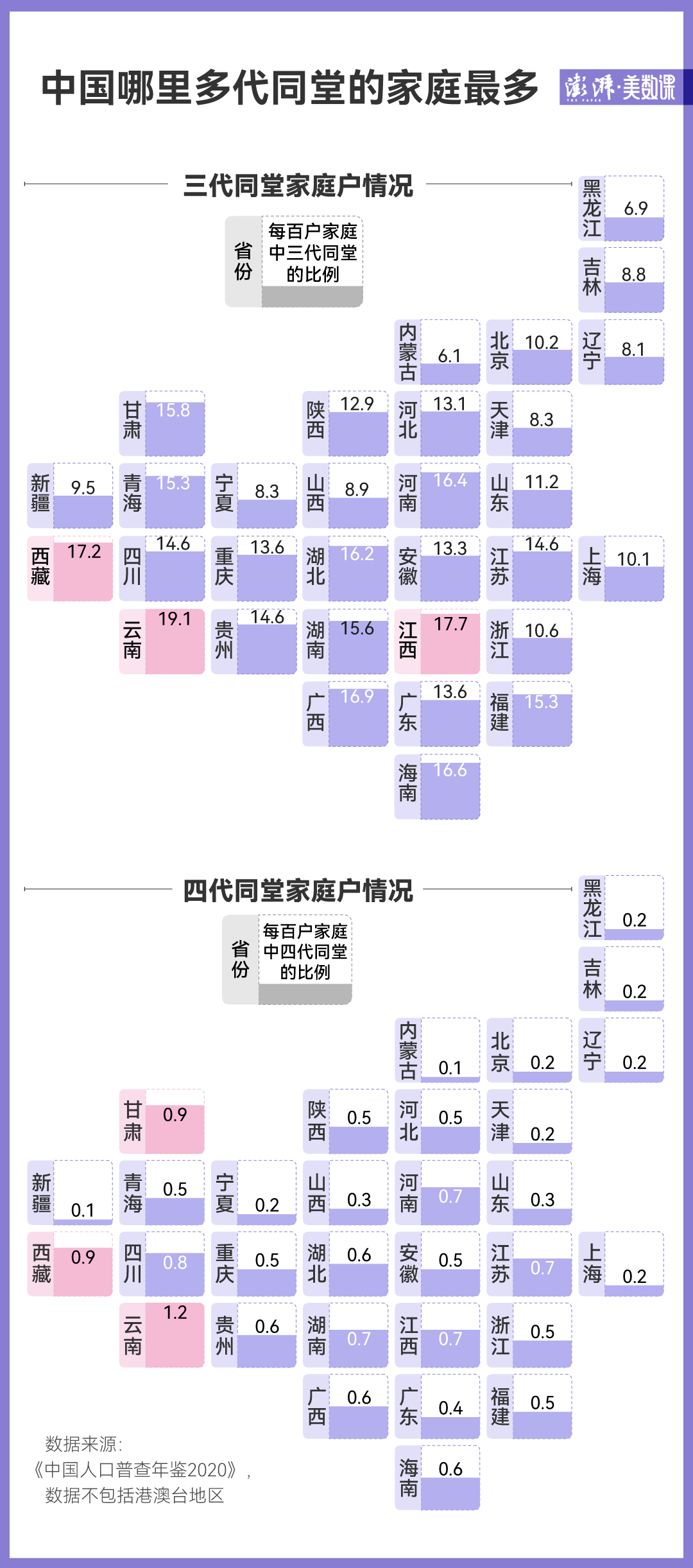从区域分布来看,多代家庭多集中于云南、西藏、甘肃等西部区域,东部地区数量相对较少。这一分布差异与各地区发展水平和人口流动趋势相呼应。随着城市化进程的加速和就业机会的增多,越来越多的人选择离开家乡前往大城市工作和生活,导致大家庭模式逐渐减少。