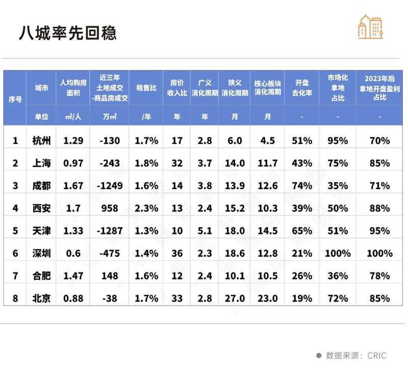 若上述三大条件在2025年一二季度得以实现,楼市将基本完成止跌,下半年开始逐步回稳。总体而言,2025年楼市上半年有望完成止跌,下半年则将延续弱复苏态势,稳步回升。杭州、上海、成都、西安、天津、深圳、合肥及北京等八大城市,作为楼市成交规模率先回稳的领头羊,其市场表现尤为值得关注。