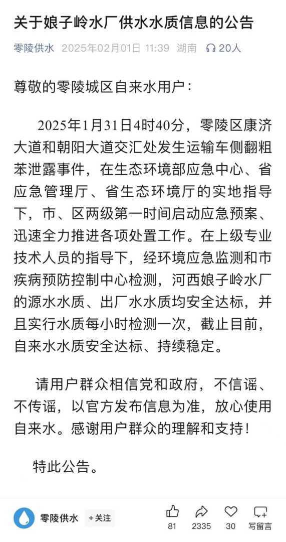 1月31日,永州零陵区发生危险化学品罐车侧翻泄漏事件,当地迅速启动应急响应,采取多项措施确保自来水水质安全,城区供水保持稳定。截至2月1日,环境应急监测结果显示自来水水质安全可控。