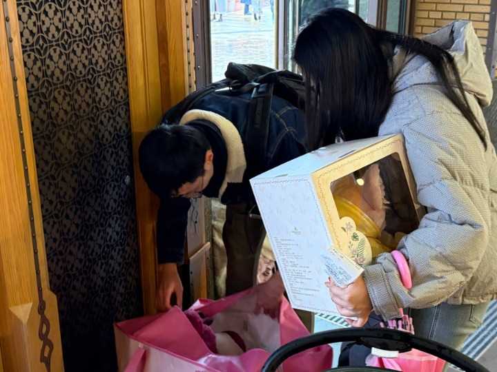 孙同学的爸爸背着硕大的迪士尼新春大礼包。沈思怡摄