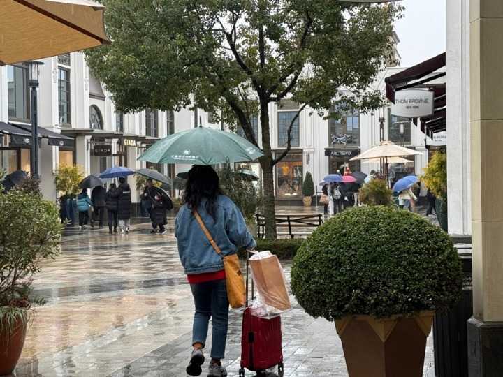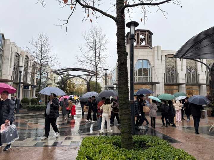 比斯特上海购物村,在雨天也未能阻挡市民游客的消费热情。沈思怡摄