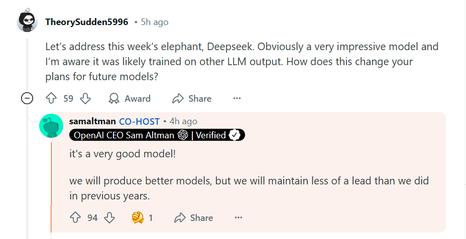 随着DeepSeek-R1的崛起,OpenAI也感受到了压力。1月31日,OpenAI正式推出了全新推理模型o3-mini,并首次向免费用户开放。OpenAI首席执行官Sam Altman在回答网友问题时,罕见承认OpenAI过去在开源方面一直站在“历史错误的一边”,并表示需要想出一个不同的开源策略。