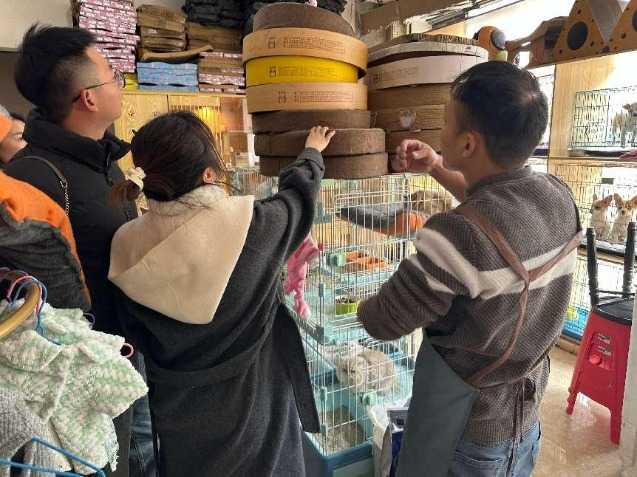 在宠物店内,财联社记者遇到了前来选购宠物的林悦。常年在外工作的她今年早早回家过年陪伴父母,然而短暂的假期让她深知无法常伴父母左右,父母在老家县城难免感到孤单。