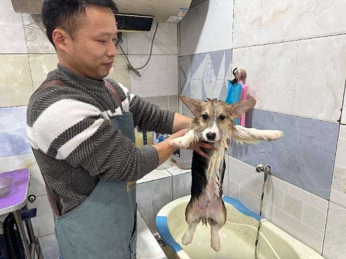 (正在洗护、等待去往新家的小柯基,财联社记者摄)