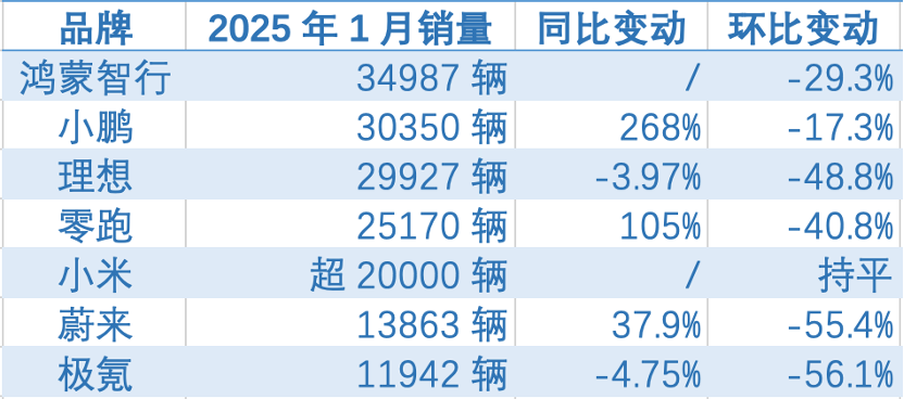 小米汽车在新能源车企中也表现出色,1月份小米SU7车型的交付量再次超过2万辆,连续四个月保持这一佳绩。尽管市场整体表现低迷,但小米汽车凭借稳定的交付表现,在竞争激烈的新能源汽车市场中赢得了消费者的青睐。