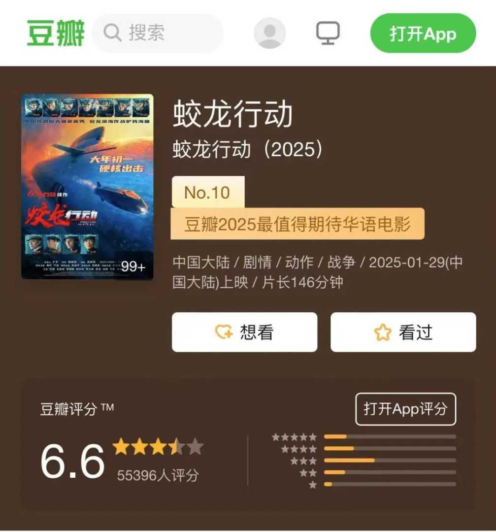 值得注意的是,《蛟龙行动》上映4天后,票房仅为2.08亿元,在春节档上映的6部电影中排名末尾。而票房冠军《哪吒之魔童闹海》的票房已达23亿元。此外,《蛟龙行动》的排片场次也排名末尾,豆瓣电影评分为6.6分。