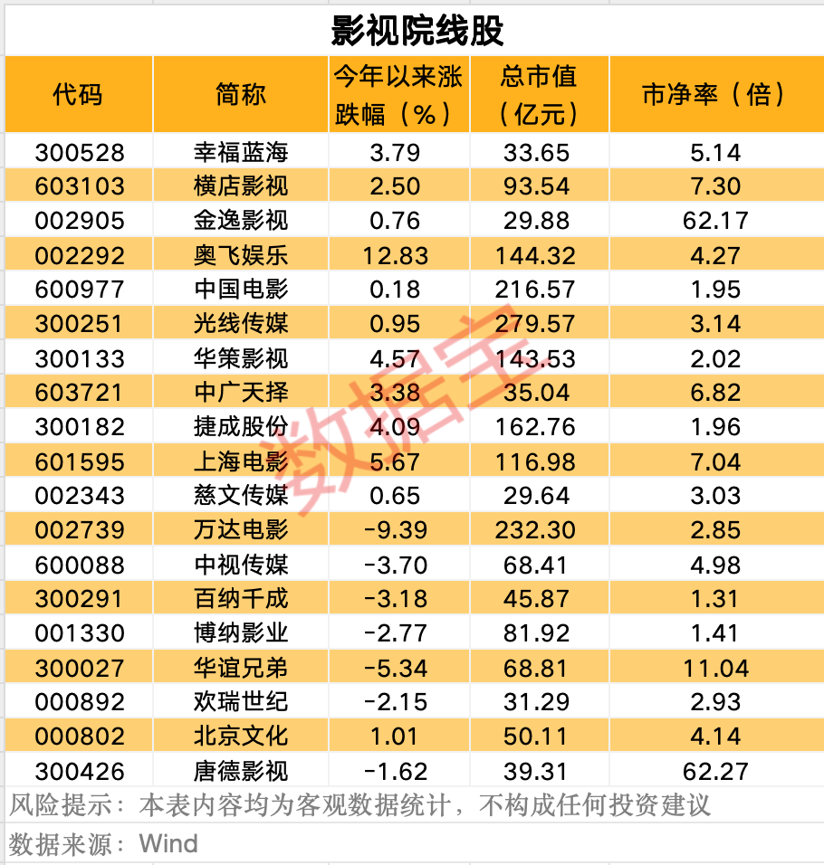 从市场表现来看,今年以来影视院线类个股普遍呈现出上涨态势,平均涨幅达到0.64%。其中,奥飞娱乐、上海电影以及华策影视的涨幅尤为显著,分别达到了12.83%、5.67%和4.57%。