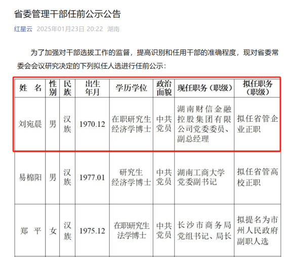 近日,湖南省委组织部发布的最新干部任前公示显示,湖南财信金融控股集团有限公司(简称“湖南财信金控”)党委委员、副总经理及财信证券董事长刘宛晨,即将出任湖南省管企业的正职领导职务。这一人事变动在金融界引起了广泛关注。